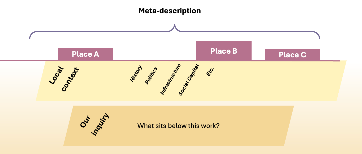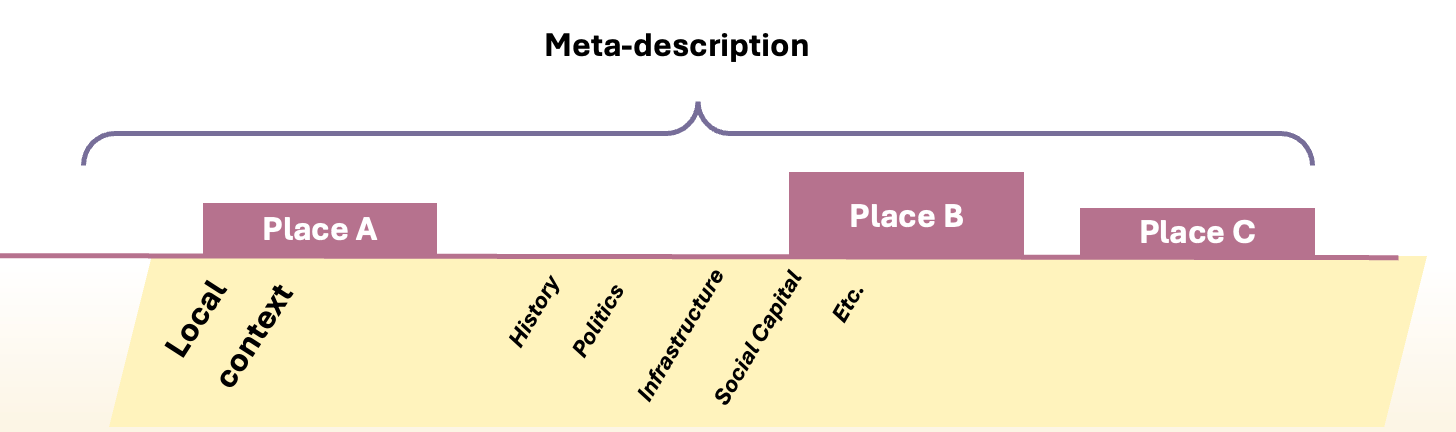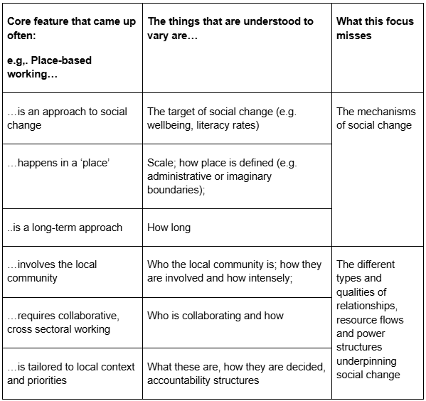 Crucially, these descriptions were all descriptive of practice. This means they aimed to give a sense of place-based work through describing the type of work people engage in, rather than systematically mapping out the underlying mechanisms of change involved in place-based working.
